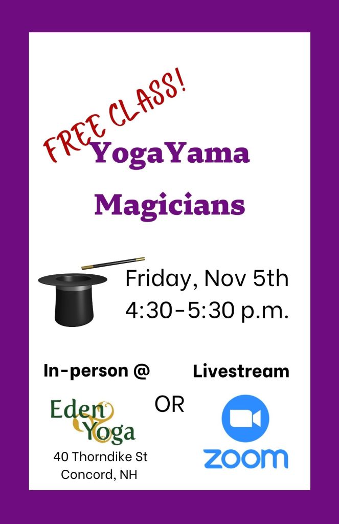 In-person classes are held at Eden Yoga, 40 Thorndike St. Concord, NH on Saturdays (see dates below) at 11:00 a.m.